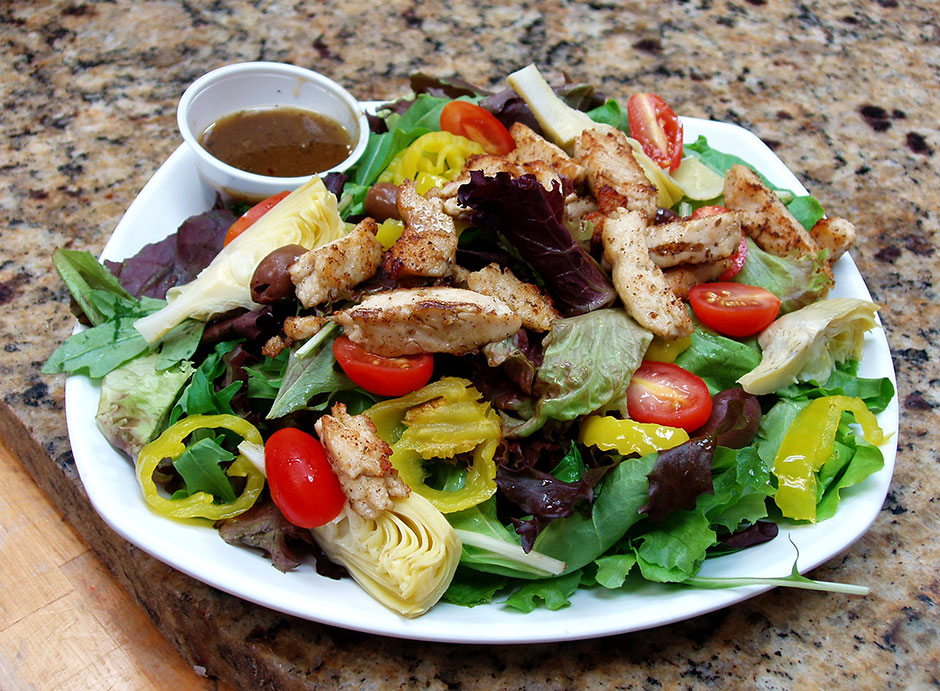 Field greens, Banana Pepper Rings, Grape Tomatoes, Kalamata Olives Artichoke Hearts and Grilled Chicken Breast. Your choice of Peppercorn Ranch or Drew’s homemade Italian dressing.